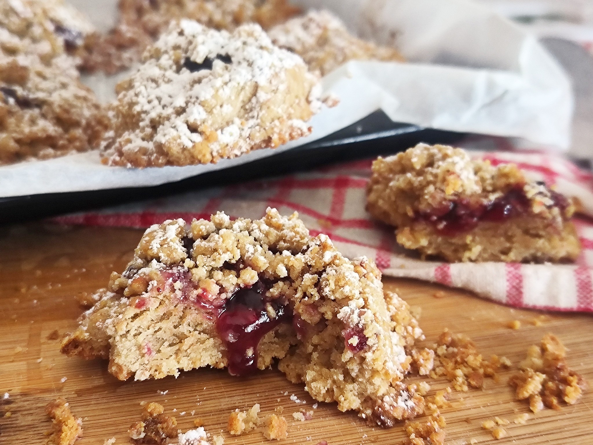 Biscotti sbriciolati con frolla ai semi di sesamo; un dolce semplice e goloso con una frolla arricchita dai semi di sesamo che la rendono più croccante e più rustica, e che si sposa benissimo con il ripieno di marmellata ai frutti di bosco.